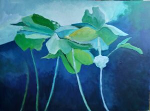 Marina van der Werf. In 1989 afgestudeerd aan de kunstacademie Minerva richting grafisch ontwerpen. “De opleiding vond ik erg leuk maar werken op een reclamebureau stond mij tegen. Ik heb het toen geprobeerd als beeldend kunstenaar wat helaas niet lukte”, aldus Marina. Heeft ze zich laten omscholen tot verzorgende IG, iets wat ze vele jaren met plezier heeft gedaan. Zo ongeveer 10 jaar geleden kreeg ze de behoefte om met textiel kunst te gaan maken en hiervoor workshops te gaan volgen. 2 jaar geleden deed ze mee met het festival Feest van de Geest waar ze het plezier van exposeren weer terug kreeg. Na Feest van de Geest volgden groepsexposities bij Hawar, galerie Concrea uit Schoonoord en de kleine kerk in Steenwijk. Ook werd ze uitgenodigd om doorlopend een paar werkstukken te exposeren bij de galerie van het Kunst Collectief Dronten, waarbij om de paar maanden nieuw werk wordt tentoongesteld. Samen met de beeldend kunstenaar Jorn den Hartog heeft ze dit jaar van 15 Januari tot 14 Februari een expositie gehad in galerie Steenwijk, waar ze met veel genoegen op terug kijk.